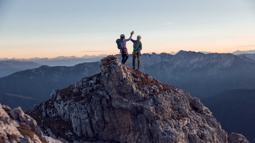 Klettern und Klettersteiggehen: Das Karwendel- und das Rofangebirge zählen zu den beliebtesten Kletterrevieren Tirols. Nicht umsonst. Mit rund 250 Sportkletterrouten setzt die Region Achensee hohe Maßstäbe im alpinen Klettersport. Schwindelfrei und trittsicher sollte man unbedingt sein, komplizierte Knoten und Seilmanöver sind jedoch nicht vonnöten, um die acht Klettersteige am Achensee zu begehen. Ein besonderes „Gustostückerl“ ist der „5 Gipfel-Klettersteig“, der über 5 imposante Gipfel im Rofangebirge führt und ein gelungener Mix aus steilen Ferrata-Passagen, wunderschönen Wanderwegen und saftigen Bergwiesen ist. Alle Informationen zum Klettern und Klettersteiggehen in der Region Achensee sind in der einer Kletterkarte zusammengefasst. Diese beinhaltet nicht nur Interessantes über das Rofan- und das Karwendelgebirge, sondern listet auch Klettergebiete und -routen mit Topos auf.