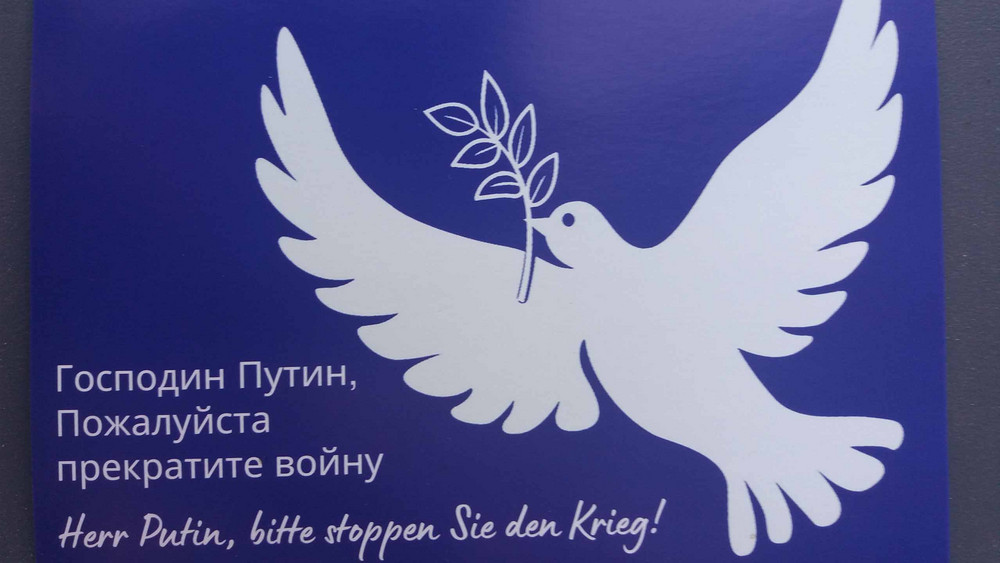 „Herr Putin, bitte stoppen Sie den Krieg!“ Das steht auf zehntausend Postkarten, die aus Hanau und Umgebung zum Kreml nach Moskau fliegen sollen. Zu sehen ist eine Friedenstaube auf dunkelblauem Grund.