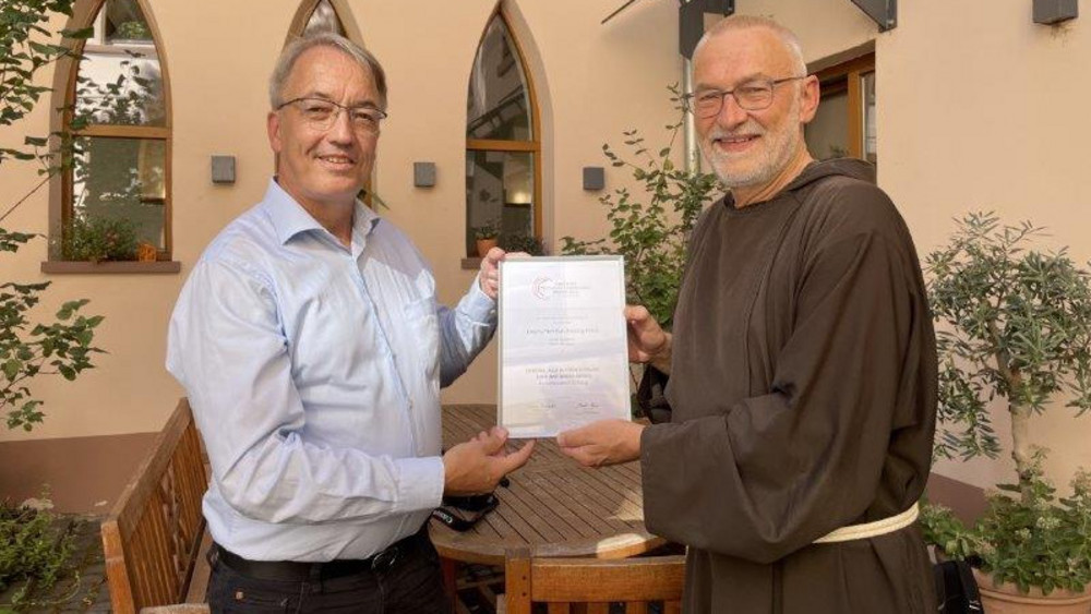 (Foto in Cloud/ Unterschrift: Martin Georgi, Vorsitzender des Deutschen Fundraising Verbandes, überreicht Bruder Paulus Terwitte, dem Vorsitzenden der Franziskustreff-Stiftung, die Urkunde)