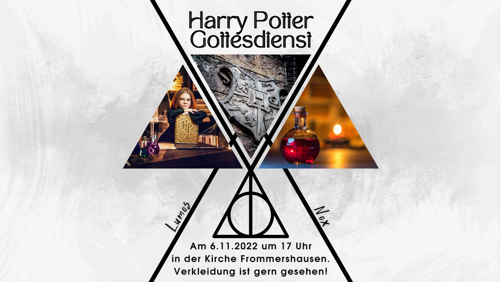 Harry Potter Gottesdienst in Vellmar am 66. November. Um 17.00 Uhr verwandelt sich die Kirche in Vellmar-Frommershausen in Hogwarts und wird mit den Fahnen der einzelnen Häuser geschmückt und mit Kerzen beleuchtet. Verkleidung der Besucherinnen und Besucher ist erwünscht. Und es werden Bertie Botts Bohnen verteilt.