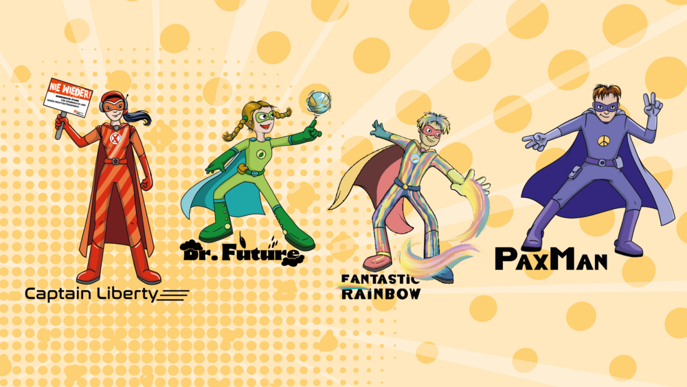 Dr. Future, Captain Liberty, Fantastic Rainbow und PaxMan – so heißen die Zukunftsheldinnen und -helden des Bistums Limburg. Sie wurden für den 103. Katholikentag in Erfurt entworfen. Unter dem Motto „Wir machen Zukunft“ präsentiert sich das Bistum mit einem Stand auf der Kirchenmeile von Donnerstag, 30. Mai, bis Samstag, 1. Juni 2024. Auch andere Bistümer sind dabei und haben viele Mitmachangebote an ihren Ständen. Zudem gehören Podiumsdiskussionen, Musikaufführungen, Gottesdienste und vieles mehr zum Programm. Der Abschlussgottesdienst ist am Sonntag, 2. Juni. Alle Infos zum Programm des Katholikentags gibt es unter katholikentag.de.