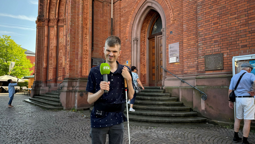 Till ist seit seiner Geburt blind. Reporter Max Löser war mit Till in Wiesbaden unterwegs. Die beiden sind vom Bahnhofsvorplatz zur Marktkirche gelaufen. Sie wollten herauszufinden, wie gut der Weg für blinde Menschen funktioniert. Die beiden waren zu Fuß und stückweise auch mit dem Bus unterwegs. Für Till ist es normal mit einem sogenannten Blindenlaufstock unterwegs zu sein. Doch auch das beste Navigationssystem kann ungeahnte Hindernisse nicht sehen, hört selbst: